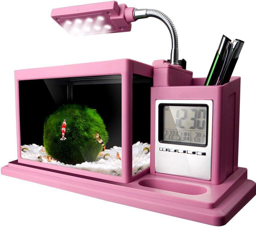 Desk mini aquarium - это уникальный аквариум, созданный для установки на рабочем столе. Оснащен диодным освещением и донным фильтром. Встроен дисплей с часами, таймером, будильником, календарем и термометром.